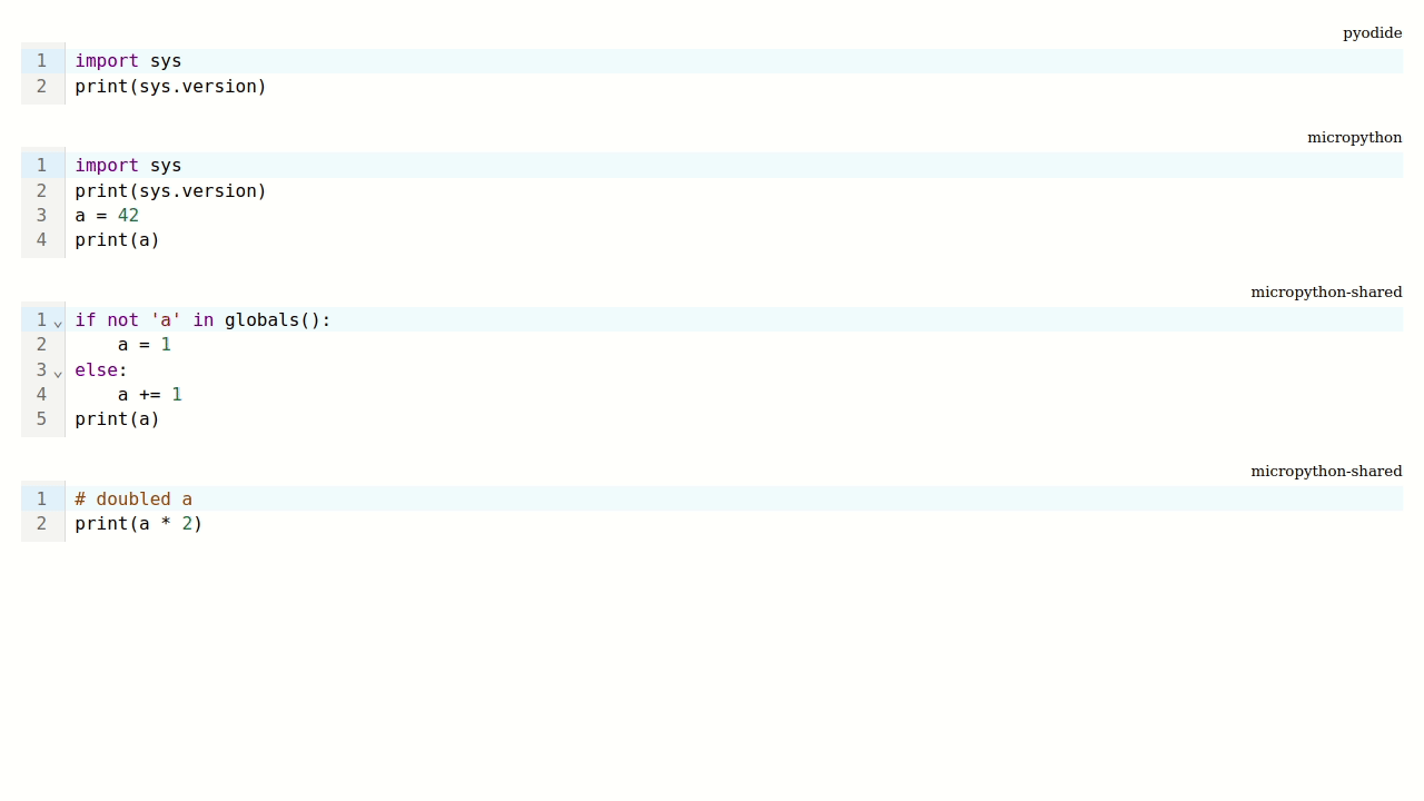 The first editor uses Pyodide, the second uses MicroPython. Each has